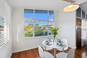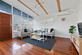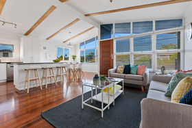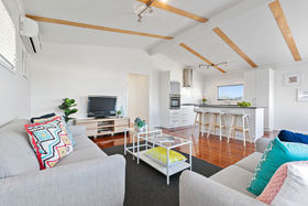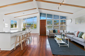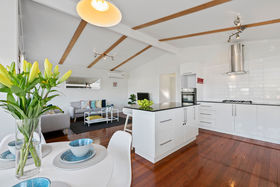 A private front patio leads you into a bright and open plan lounge and dining room. Featuring cathedral ceilings and an array of large windows perfectly positioned to capture the afternoon breezes. Freshly painted neutral tones and stunning timber floorboards flow seamlessly through the home.